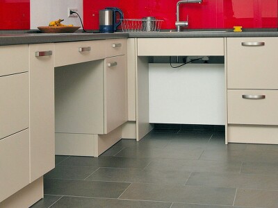 Wichtig für die Küchenplanung: Der Herd, an dem man kocht, die Arbeitsplatte und die Spüle sollten so auf- und eingebaut werden, dass man gut mit einem Rollstuhl darunter fahren kann. Dabei gilt: Die Höhe muss sich am Rollstuhlfahrer orientieren! Damit eine Spüle unterfahren werden kann, muss man einen Unterputz oder Flach-Aufputz-Siphon anbringen. Auch muss in der Küche selbst genügend Raum sein, damit man sich in einem Rollstuhl gut vor und zurück bewegen kann.
